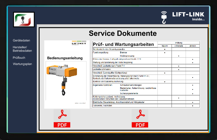 -ist das zentrale Identifikations- und Prüfdokument für Ihr Hubgerät. Einträge sind nach Speicherung nur noch einsehbar: Natürlich besteht die Möglichkeit, das Dokument direkt im PDF-Format herunterzuladen